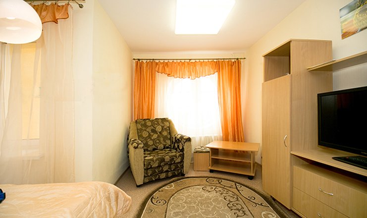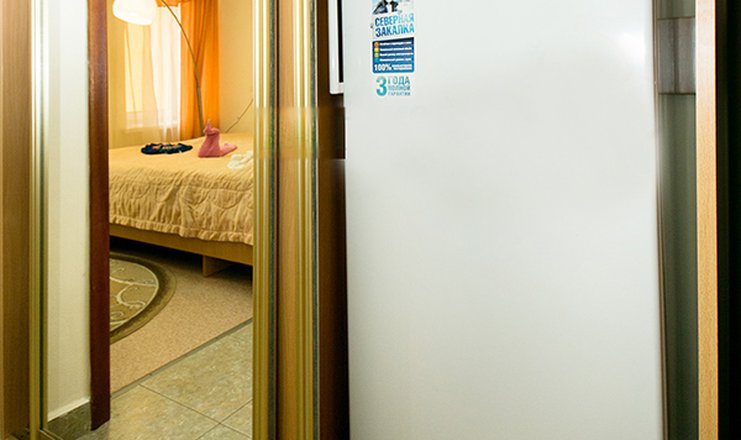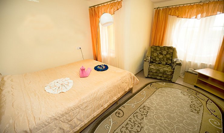В номере: вешалка, диван раскладной, зеркало, кресло-кровать, кровать двуспальная, прикроватные тумбочки, столик журнальный, шкаф набор посуды, телевизор, холодильник, электрочайник,